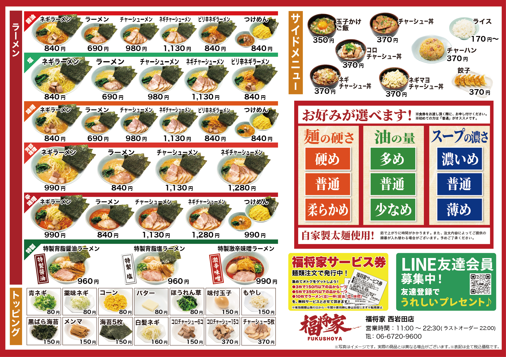 特製だれは醤油・味噌・塩、それぞれに独自のブレンドで仕上げたこだわりの味。スープに負けない力強さと心地よいのど越しを叶えるのは、高級小麦で丹念につくった自家製麺。すべての要素が主張しながら、ひとつになった一杯です。